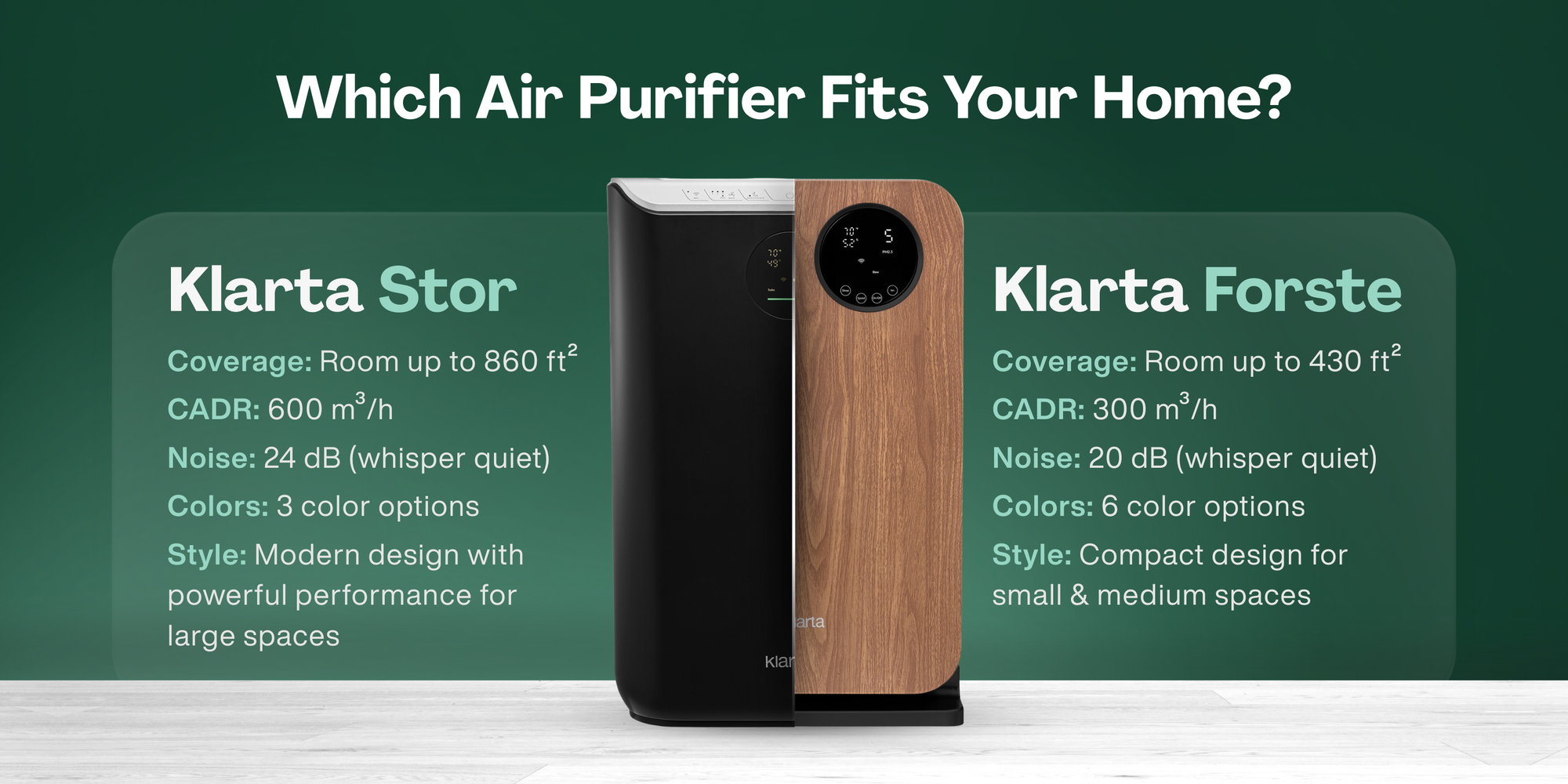 The Klarta smart air purifier you choose should depend on the size of your space and needs. See our comparison table for more information.